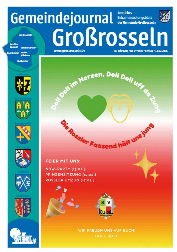 Das Rathaus der Gemeinde Großrosseln ist „an der Faasend“ 2026 wie folgt geschlossen: