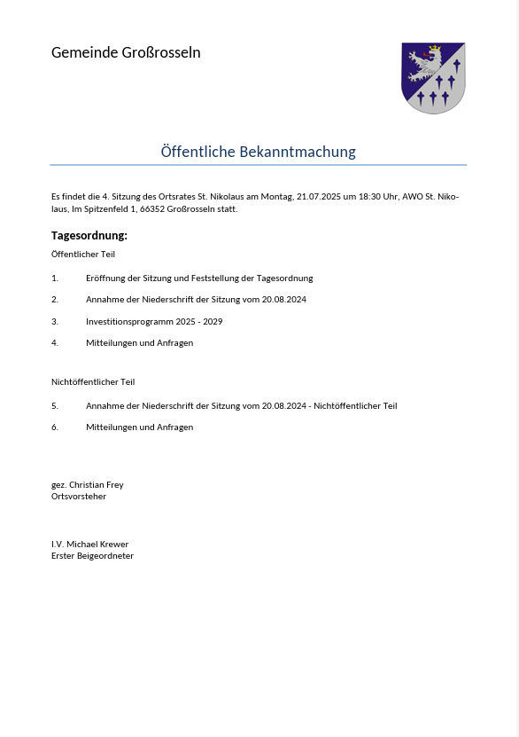Inhalt der öffentlichen Bekanntmachung: Bekanntmachung über die 4. Sitzung des Ortsrates St. Nikolaus am Montag, 21.07.2025 um 18:30 Uhr.