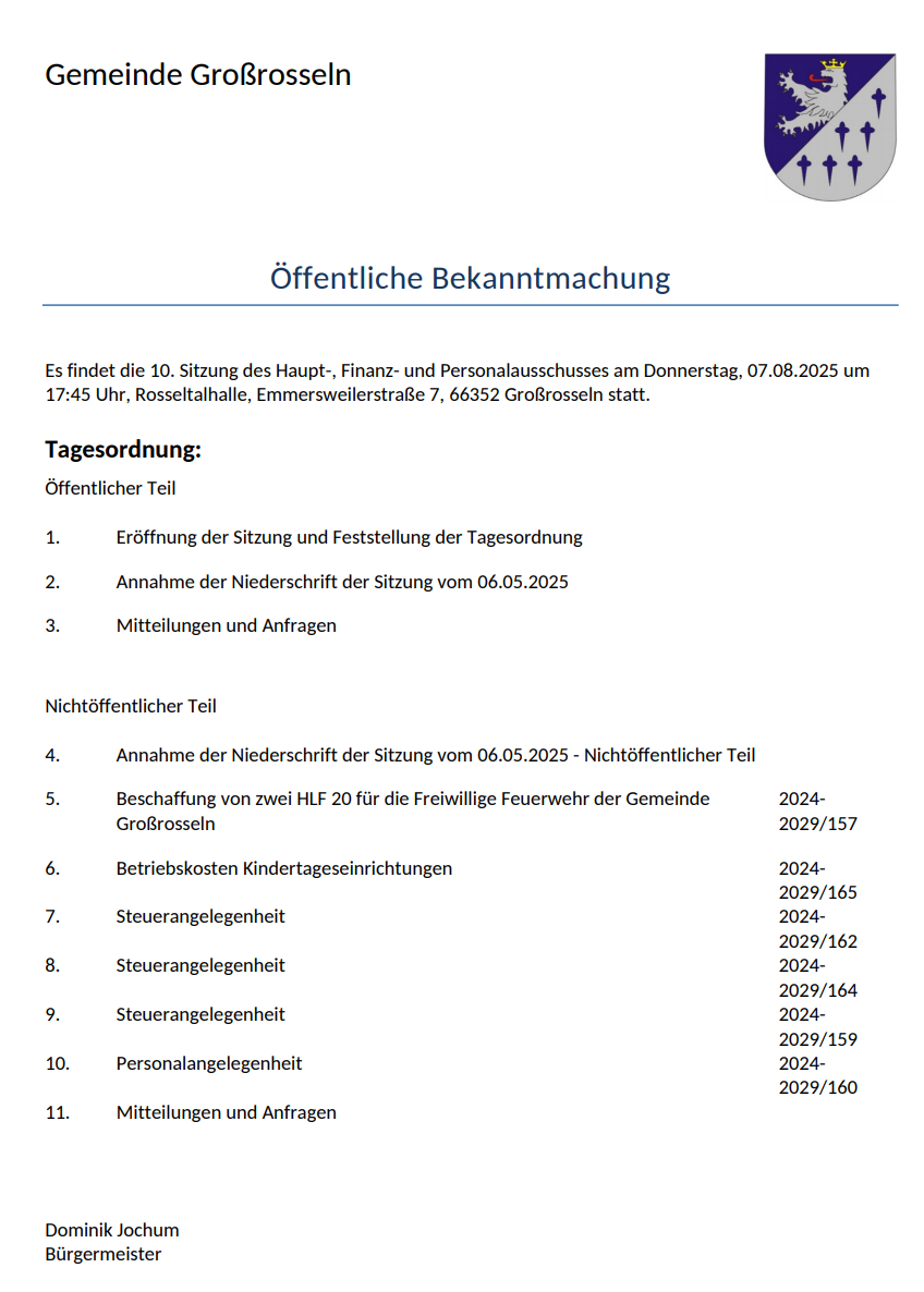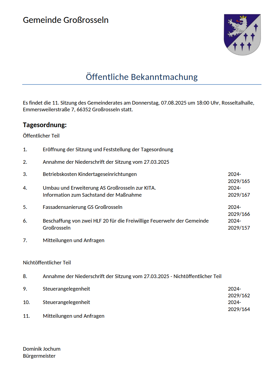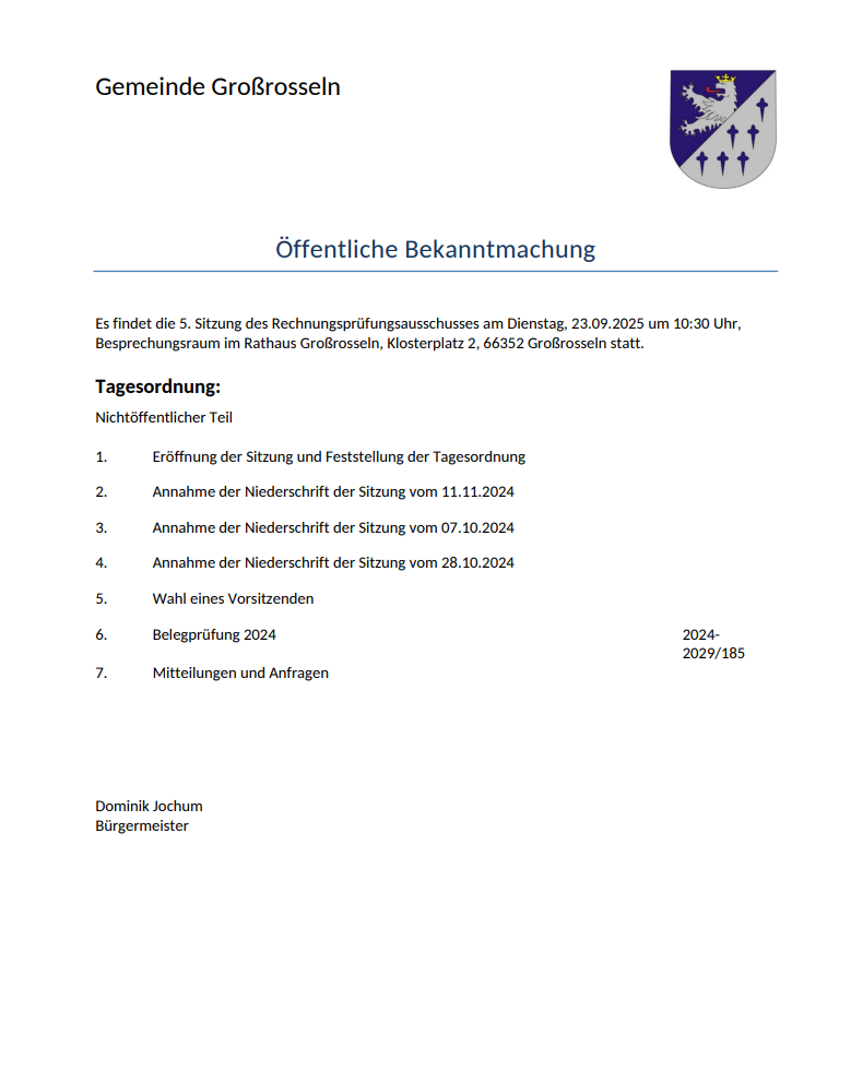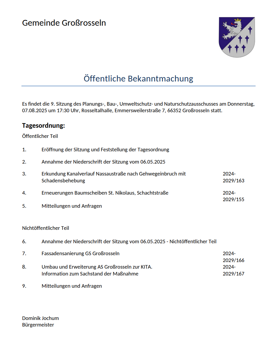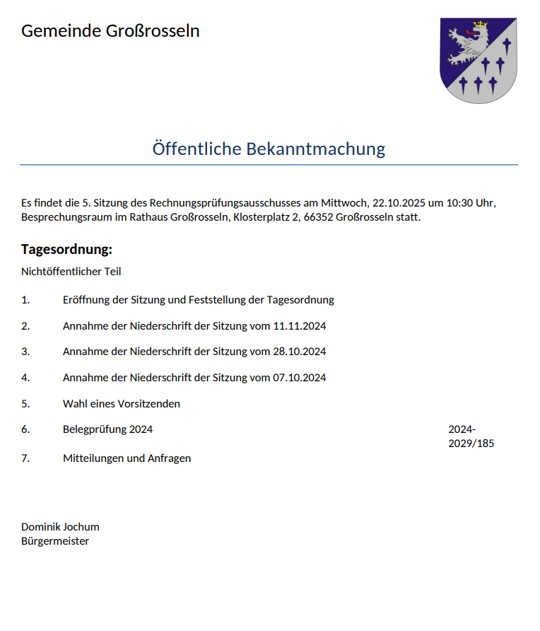 Inhalt der öffentlichen Bekanntmachung: Bekanntmachung über die 5. Sitzung des Ortsrates Großrosseln am Montag, 04.08.2025 um 18:00 Uhr.