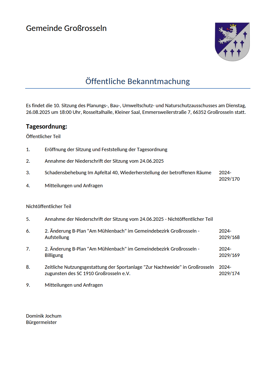 Inhalt der öffentlichen Bekanntmachung: Bekanntmachung über die 10. Sitzung des Planungs-, Bau-, Umweltschutz- und Naturschutzausschusses am Dienstag, 26.08.2025 um 18:00 Uhr.