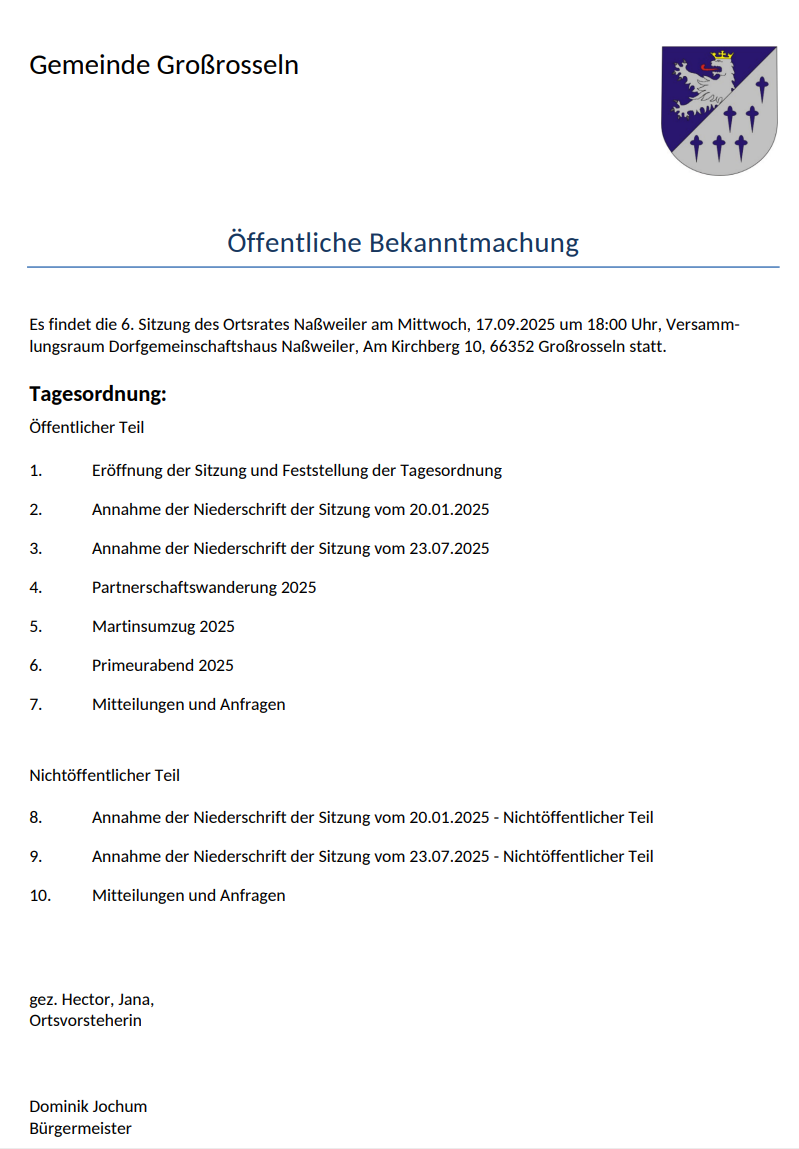 Inhalt der öffentlichen Bekanntmachung: Bekanntmachung über die 6. Sitzung des Ortsrates Naßweiler am Mittwoch 17.09.2025 um 18:00 Uhr.