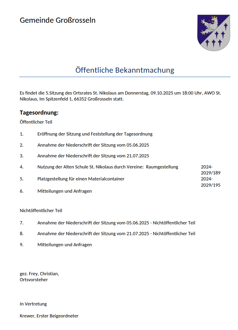 Inhalt der öffentlichen Bekanntmachung: Bekanntmachung über die 5. Sitzung des Ortsrates St. Nikolaus am Donnerstag 09.10.2025 um 18:00 Uhr.
