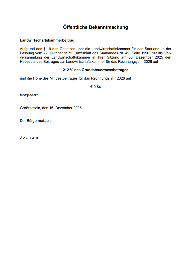 Inhalt der öffentlichen Bekanntmachung: Hebesatz des Beitrages zur Landwirtschaftskammer für das Rechnungsjahr 2026.
