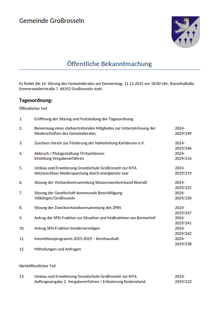 Inhalt der öffentlichen Bekanntmachung: Bekanntmachung über die 7. Sitzung des Ortsrates Großrosseln am Montag, 01.12.2025 um 17:30 Uhr.