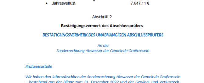 Jahresabschluss 2022 der Gemeinde Großrosseln Inhalt der öffentlichen Bekanntmachung: Bekanntmachung über den Jahresabschluss 2022 der Gemeinde Großrosseln. 2022 der Sonderrechnung Abwasser. Gemäß § 12 Absatz 4 Kommunalselbstverwaltungsgesetz - KSVG - in der Fassung vom 27. Juni 1997 (Amtsbl. S. 682), zuletzt geändert durch Gesetz vom 18. Januar 2023 (Amtsbl. I S. 204), in Verbindung mit § 1 Absatz 1 der Satzung der Gemeinde Großrosseln über die Form der öffentlichen Bekanntmachung (Bekanntmachungssatzung) vom 05. November 2020 wird die nachstehende Satzung öffentlich bekanntgemacht. Download als PDF < Zurück