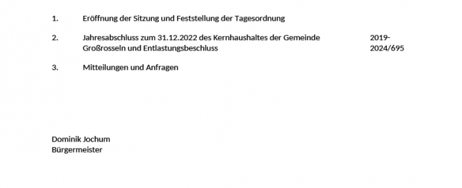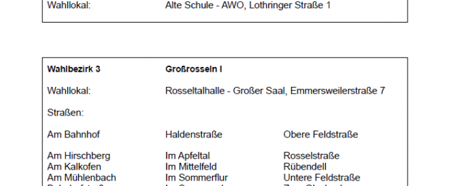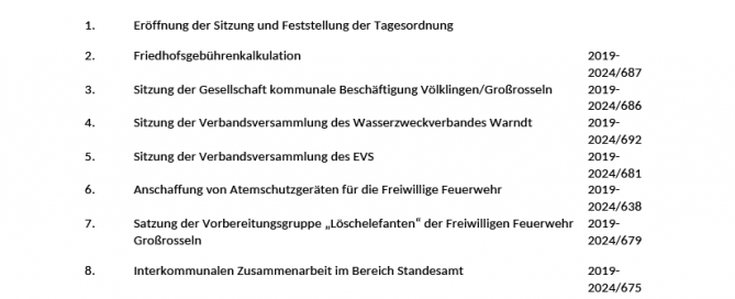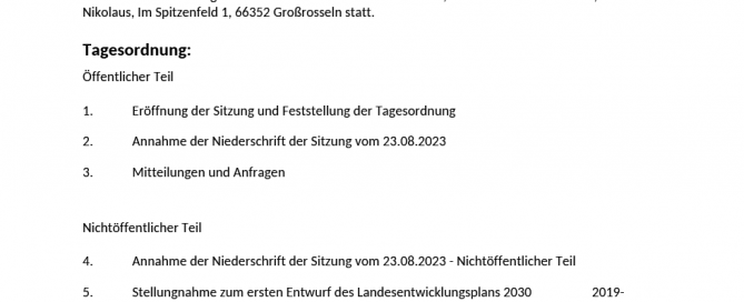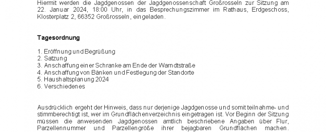 Jagdgenossenschaft Großrosseln Hiermit werden die Jagdgenossen der Jagdgenossenschaft Großrosseln zur Sitzung am 22. Januar 2024, 18:00 Uhr, in das Besprechungszimmer im Rathaus, Erdgeschoss, Klosterplatz 2, 66352 Großrosseln, eingeladen. Tagesordnung Eröffnung und Begrüßung Satzung Anschaffung einer Schranke am Ende der Warndtstraße Anschaffung von Bänken und Festlegung der Standorte Haushaltsplanung 2024 Verschiedenes Ausdrücklich ergeht der Hinweis, dass nur derjenige Jagdgenosse und somit teilnahme- und stimmberechtigt ist, wer im Grundflächenverzeichnis eingetragen ist. Vor Beginn der Sitzung müssen die anwesenden Jagdgenossen amtlich beschriebene Angaben über Flur, Parzellennummer und Parzellengröße ihrer bejagbaren Grundflächen machen. Veränderungen gegenüber dem Grundflächenverzeichnis sind durch Vorlage von Grundbuchmitteilungen oder notariellen [...]