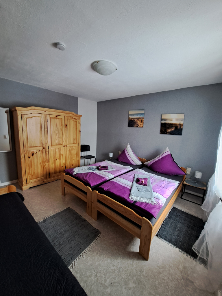 1 Schlafzimmer (2 Einzelbetten DG, 3 Einzelbetten OG) bei Bedarf können die Betten zum Doppelbett zusammen gestellt werden